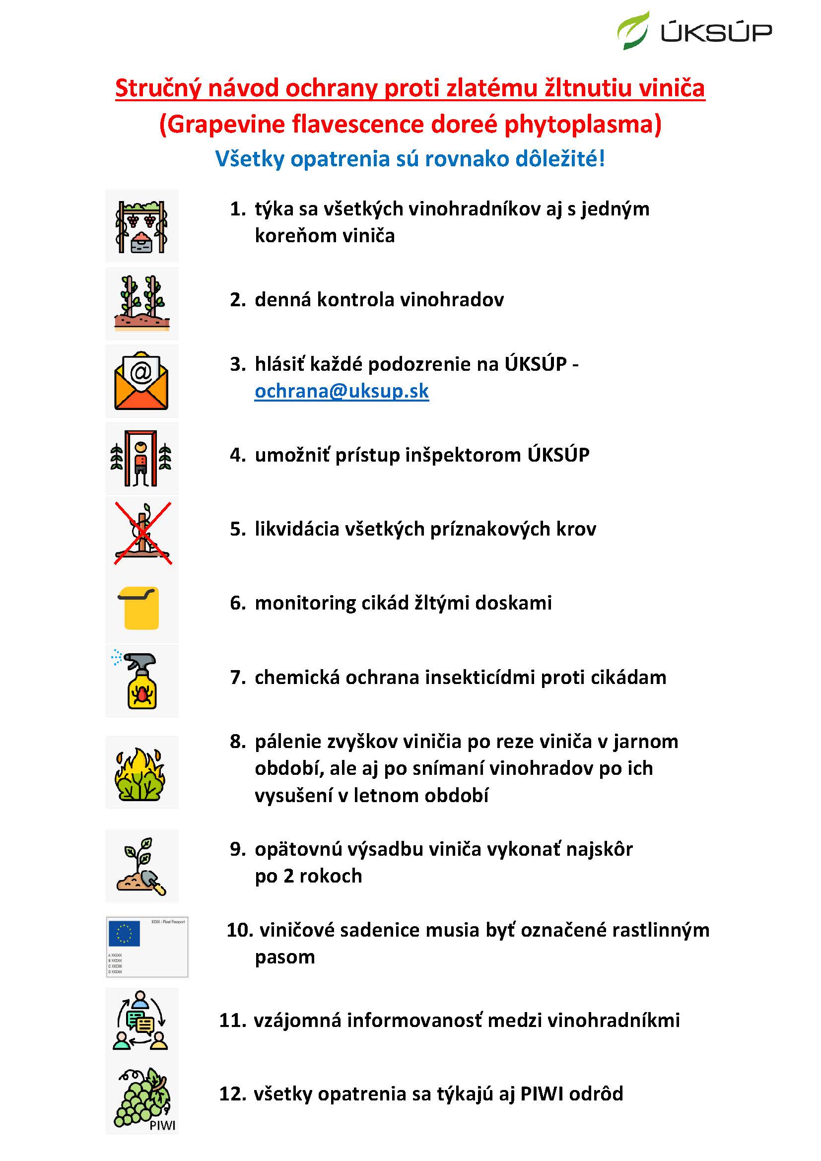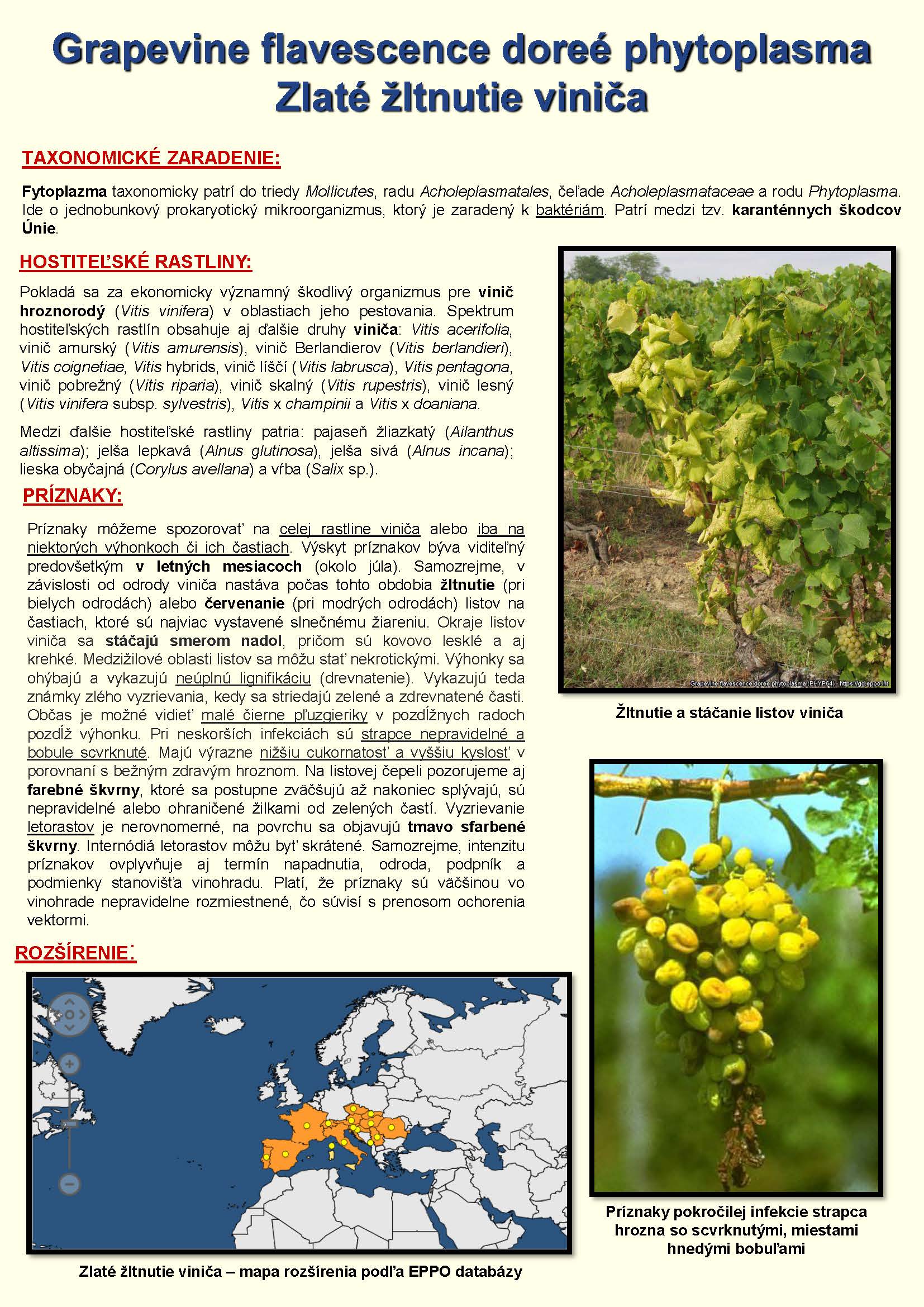 Vzhľadom na rýchly nárast viditeľných príznakov karanténnej choroby viniča s názvom zlaté žltnutia viniča (Grapevine flavescence dorée phytoplasma), Ústredný kontrolný a skúšobný ústav poľnohospodársky v Bratislave dáva do pozornosti naliehavé upozornenie na zamedzenie šírenia tejto choroby.