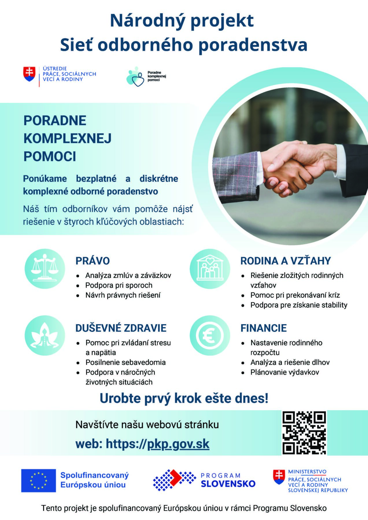 Úrad práce a sociálnych vecí Partizánske – odborné poradne vznikli po celom Slovensku (46 poradní) a vznikli spojením dvoch projektov: Rodinné poradne a Bezplatné dlhové poradne. Hlavným cieľom je posilniť vzťahy v rodine, porozumenie medzi generáciami a zároveň poskytovať odbornú pomoc a návody na zvládanie náročných finančných situácií. Poskytujeme bezplatné psychologické, právne, sociálne a ekonomické poradenstvo s odborníkmi v jednotlivých oblastiach. Najčastejšie prípady, ktoré riešime ,sú napr. výživné na dieťa ,strata zamestnania, exekúcie, dedičstvo, zhodnotenie a nastavenie rodinného rozpočtu, poradenstvo v oblasti vyhlásenia osobného bankrotu, rozvody a vysporiadanie manželov, riešenie partnerských, rodinných a medziľudských konfliktov…Bezplatné poradenstvo je poskytované všetkým plnoletým osobám, FO v nepriaznivej sociálnej situácií, marginalizovaným komunitám, osobám so zdravotným postihnutím ,domácnostiam vystavených riziku chudoby atď.